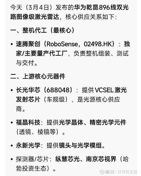 $长光华芯(SH688048)$ 今天下午华为乾昆896线激光雷达正式发布,长光华芯直接受益!作为华为激光雷达VCSEL发射芯片核心供应商,896线是当前全球量产最高规格,将率先搭载问界M9、尊界S800等旗舰车型。高线数雷达放量,直接拉动激光芯片需求,车规级业务进入量价齐升周期,长期成长逻辑再强化。