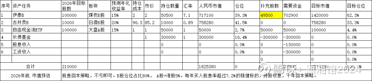 预计2026年伊泰将启动转A的事宜,抓紧最后建仓机会,将持股数量提高1倍至100000股。所有资金将为这一目标让路。如果转A能够成功,这就是一笔拆迁款一次性到位。不转A也是每年稳定10%以上的收益,非常稳健。这个是压舱石的存在。从港股通到 A 股,都看了一遍,居然没有让自己敢于下手的标的,还是守好自己的一亩三分地罢了。伊泰B每年10%是没有问题的。 叠加煤炭反内卷,2026年煤炭价格可期。2026年如果每股利润1.5元,那2027年伊泰这一块的股息就可以15万,非常期待。