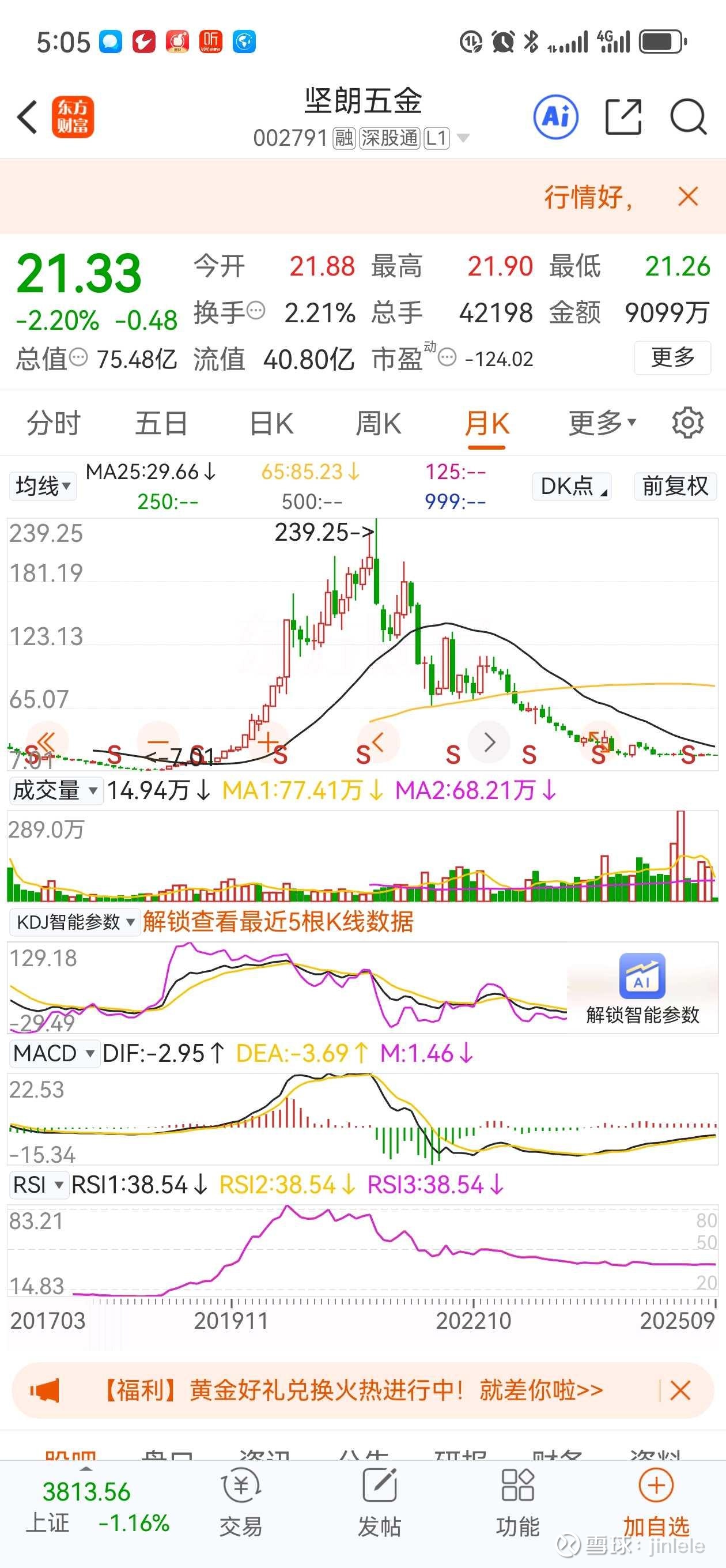 坚朗五金002791从2018年10月最低7.01元(复权),大涨到2021年8月最高的239元(复权),不到三年时间股价大涨23倍以上,算是疫情期间最牛逼的个股之一。