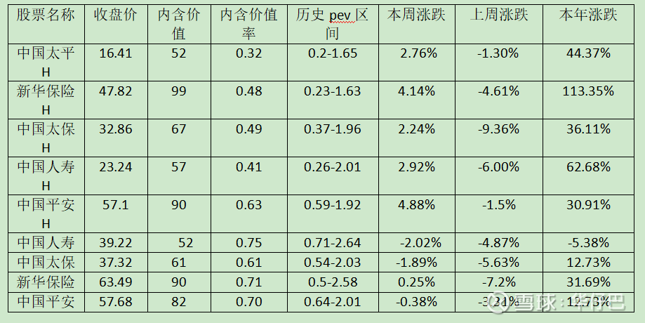本周H股保险股均大涨,A股基本是以下跌为主,还是延续本年度以来的整体H股涨幅大于A股的表现,H股涨幅最好的是新华保险H,涨幅最差的是中国平安H,H股内含价值率最高的是中国平安H,最低的是中国太平H;A股涨幅最好的依然是新华保险,涨幅最差的是中国人寿,是两市中唯一一支年内下跌