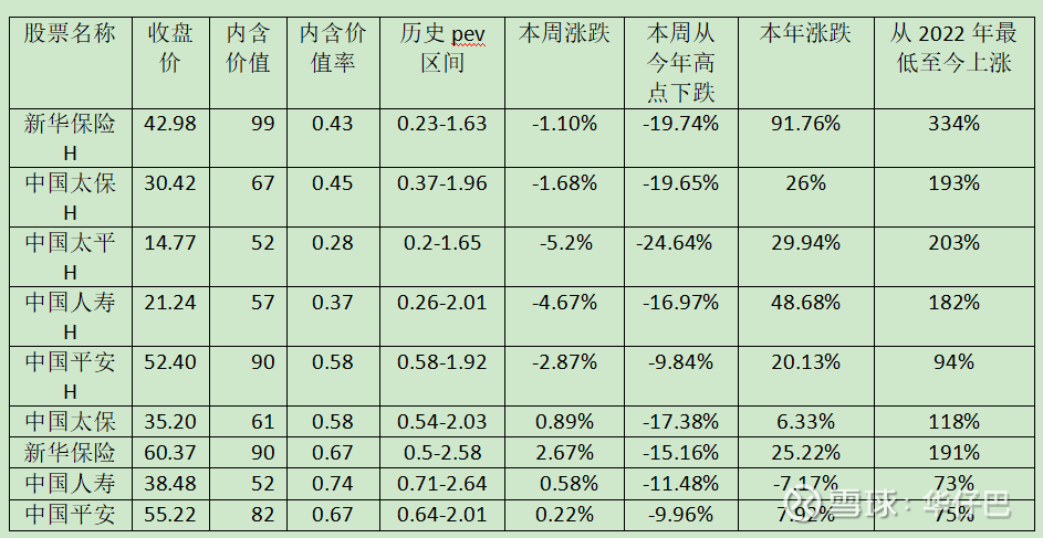 3、统计保险股从今年高点下跌以来的跌幅,中国太平保险-24.64%港股跌幅最大,新华保险H跌-19.74%排第二,A股中国太保跌-17.38%,排名第一,新华保险跌幅-15.16%跌幅第二;中国平安港股跌幅-9.84%,A股跌幅-9.96%均在本次调整中跌幅最少,中国人寿A今年没怎么涨,但跌起来也不少,主要内含价值率最高。H股今年总体好于A股主要是低估加港股通及国际资本买入所致。