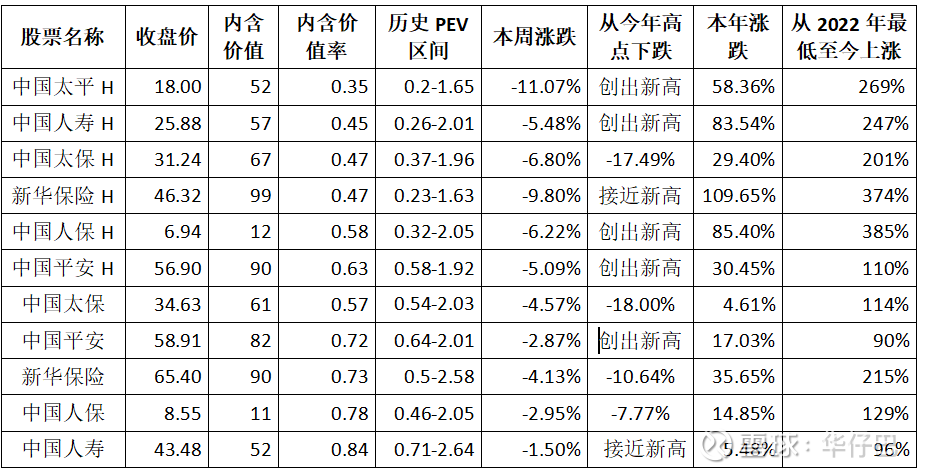 内含价值率最低的是中国太平0.35,0.45-0.47的有三支:中国人寿H、中国太保H、新华保险H;0.5以上的一支是中国人保H,0.6以上的一支中国平安H,中国平安H是港股的带头大哥,平稳进退,退一进二。