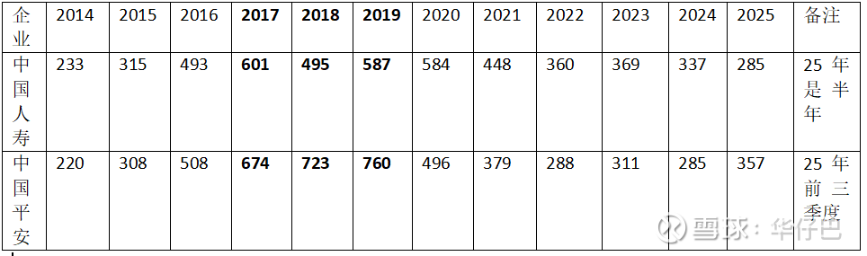 5、看一家保险企业是否发展的好,从负债端看主要看新业务价值以及新业务价值率,上周看了中国平安,本周看看世界第一大寿险公司中国人寿,看看近十年的新业务价值情况,下图是2014年到2025年共11.5年,2025年是半年的,单位是亿元。