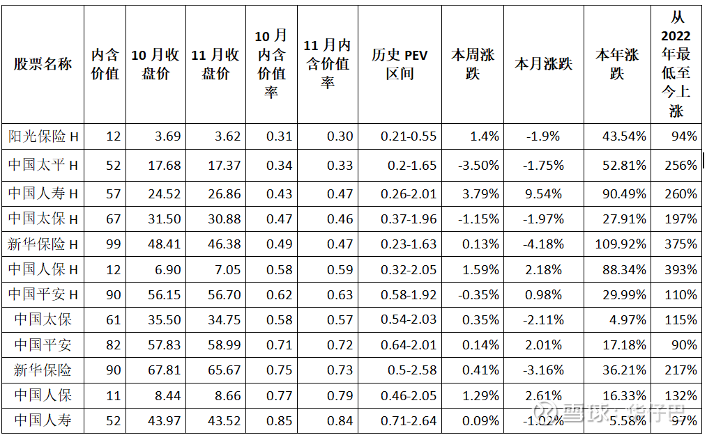 本月应球友要求将阳光保险加入,我将上表按照10月底内含价值率从小到大进行排列,11月份港股中国人寿H独树一帜涨幅9.54%,中国人保H涨2.18%排第二,中国平安H涨幅0.98%,新华保险H跌幅-4.18%排跌幅第一;