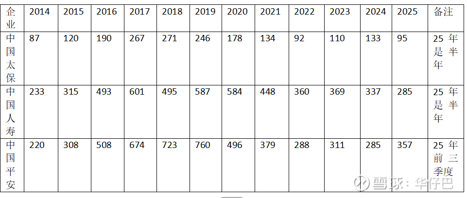 从上表看:中国太保从2019年就开始下滑了,直到2022年见底,然后重新开始增长,中国平安从2020年开始下跌直到2024年,2025年开始大幅增长,只不过21-24属于在小区间下滑,中国人寿是从2020年小幅下滑,2021年开始大幅下滑,到2022-2024在小区间下滑,因此整个行业从19年太保首先没有挺住下滑,随后人寿、平安从2020年开始下滑,实际行业是有迹可寻的。