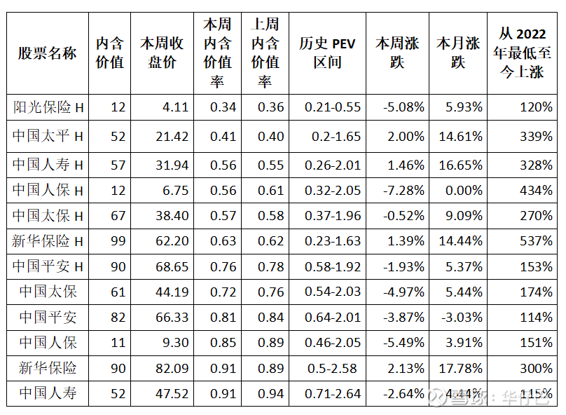 内含价值率最低的是阳光保险0.34,港股唯一一支0.4以下险股,中国太平H0.41; 0.50以上的有三支:中国人寿H、中国太保H、中国人保H;0.6以上的一只新华保险H,0.7以上的一支中国平安H,中国平安H是港股的带头大哥,带着一众小弟继续向上进军。本周涨幅最高的是中国太平H,上涨2%,第二是中国人寿H上涨1.46%;下跌最多的是中国人保H,下跌-7.28%,第二是阳光保险,下跌-5.08%。