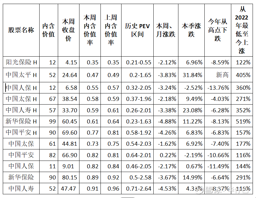 内含价值率最低的是阳光保险0.35,港股唯一一支0.4以下险股,中国太平H0.47; 0.50以上的有三只:中国人寿H、中国太保H、中国人保H;0.