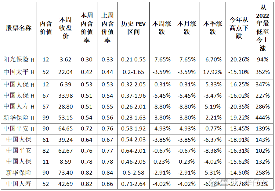 A股龙头是中国人寿,中国人寿与新华保险内含价值率并列最高为0.82,中国人保是0.78,中国平安0.76,最低的是中国太保0.64,A股本周中国人保上涨0.23%是A股唯一一支上涨的保险股票,下跌最多的是中国人寿,下跌-4.02%;总体上A股保险股以下跌为主,本周跑输大盘。