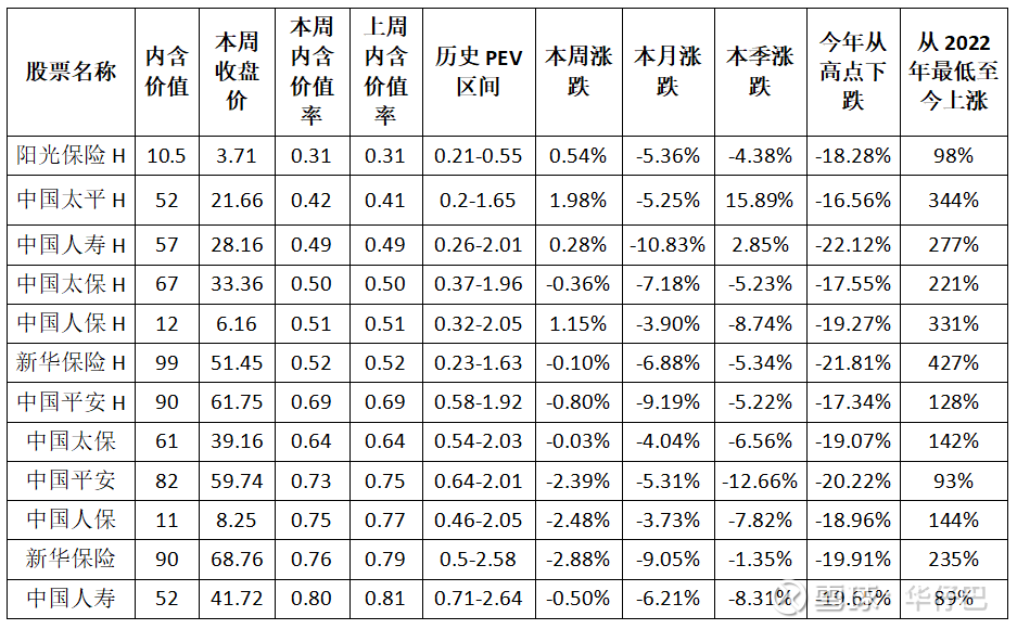 内含价值率最低的是阳光保险0.31,港股唯一一支0.4以下险股,0.4以上的两支中国太平0.42、中国人寿H0.49; 0.50以上的有三支:中国太保H、中国人保H、新华保险H;0.6以上的一支中国平安H,断崖式领先,中国平安H毫无疑问是港股的龙头。本周港股保险股与上周相比,下跌趋缓,上周除阳光保险外,其他均下跌;本周平安H、新华H、太保H微跌,其他三支均上涨,涨幅最好的是中国太平H,上涨1.98%,中国人保H上涨1.15%。总体香港保险股在如此恶略的外部环境下,本周跑赢大盘,开始趋稳,本周上涨股票比上周增加两支;