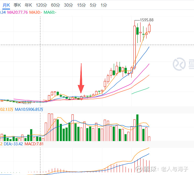 派斯林本月线位置等同于寒武纪箭头标识月。本月强势突破所有月均线,股势开始转强。后续和寒武纪一样,在月均线之上盘整3个月左右开始进入第一波拉升。