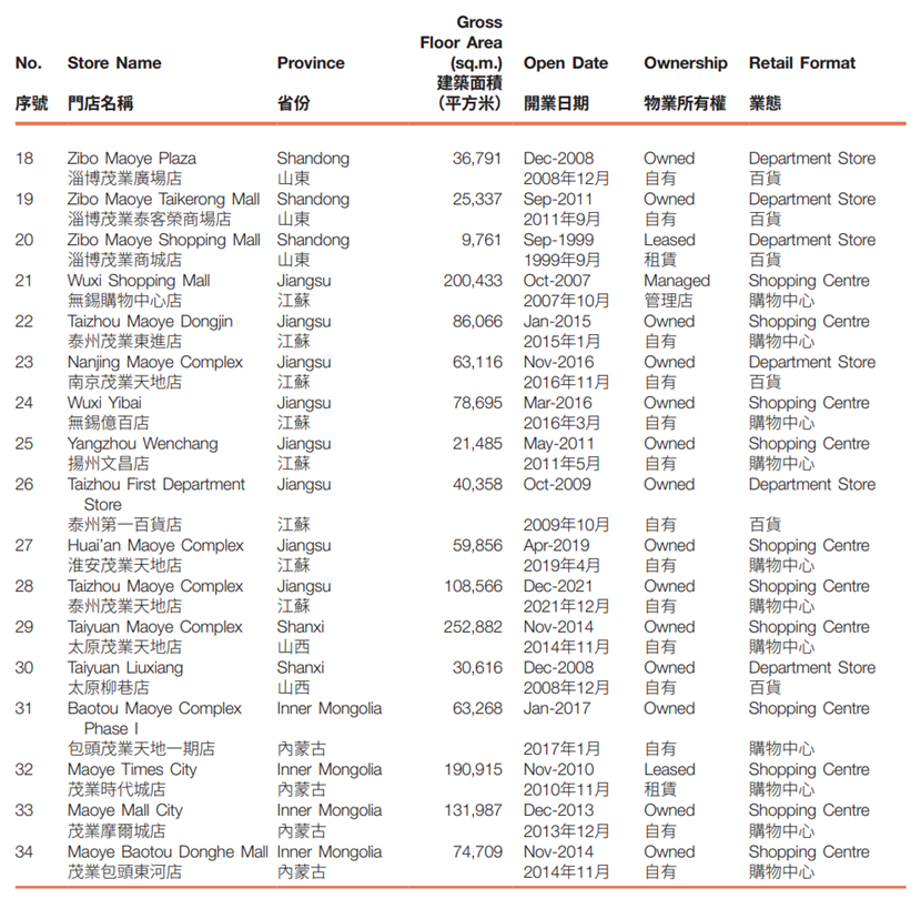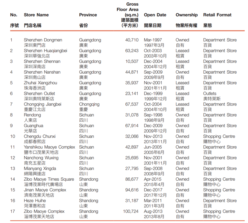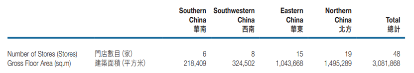 截至2025年6月30日,本集 团共于全国21个城市经营及管理48家门店, 总建筑面积达约3.1百万平方米,其中自有物 业建筑面积占比为79.3%。覆盖的重点城市 包括广东深圳及珠海;四川成都、南充及绵 阳;重庆;江苏无锡、扬州、泰州、南京及淮 安;山东淄博、济南和菏泽;河北秦皇岛及保 定;辽宁沈阳及锦州;山西太原;以及内蒙古 呼和浩特和包头。