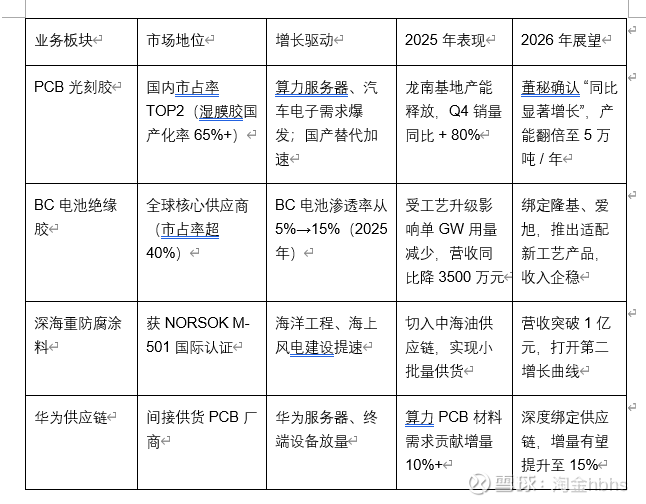 2. 2026 年:归母净利润 3900 万元(同比 + 132%,核心驱动:PCB 光刻胶产能释放 + 深海涂料放量)