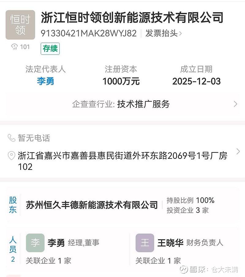 $*ST恒久(SZ002808)$前几天,恒久成立了一新公司,有点意思。一,不在“液冷PACK产线”相关两公司海希浙江、浙江凯翔宇的注册地湖州安吉县,而是在不相邻的嘉兴嘉善县;二,经营范围是:新兴能源、电池制造、输配电设备制造…三,年底新成立公司,基本上对今年营收无影响,可能是明年的经营注入方向…