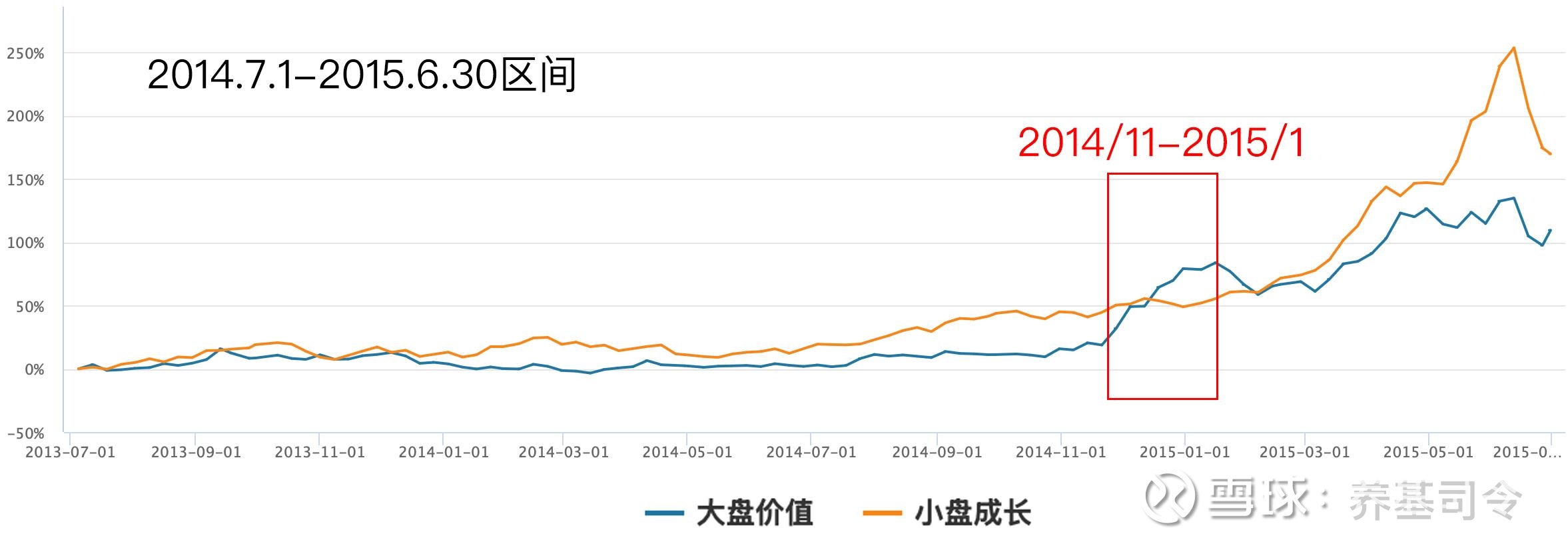 再比如2013-2015年TMT牛市中,市场风格偏向小盘成长,整体表现最强的主线板块,主要是受益于移动互联网产业趋势的TMT行业。但是2014年11月-2015年1月区间,市场风格发生了较剧烈的变化,从小盘成长快速向大盘价值切换,前期表现较弱的金融板块在这一阶段却最强,而前期主线TMT板块表现却较弱。