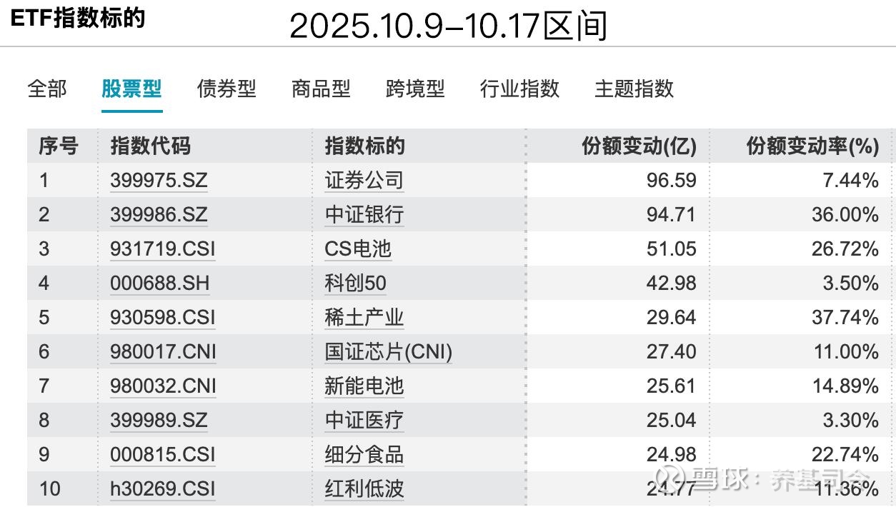 Wind统计显示,2025.10.9-10.17区间,ETF指标标的流入靠前的,既有“老登”价值风格证券公司、中证银行、稀土产业、细分食品、红利低波,也有“小登”成长风格科创50、国证芯片,还有“中登” CS电池、新能电池、中证医疗。此外,恒生科技、恒生互联网科技业,两只港股科技指数份额同样大幅流入。