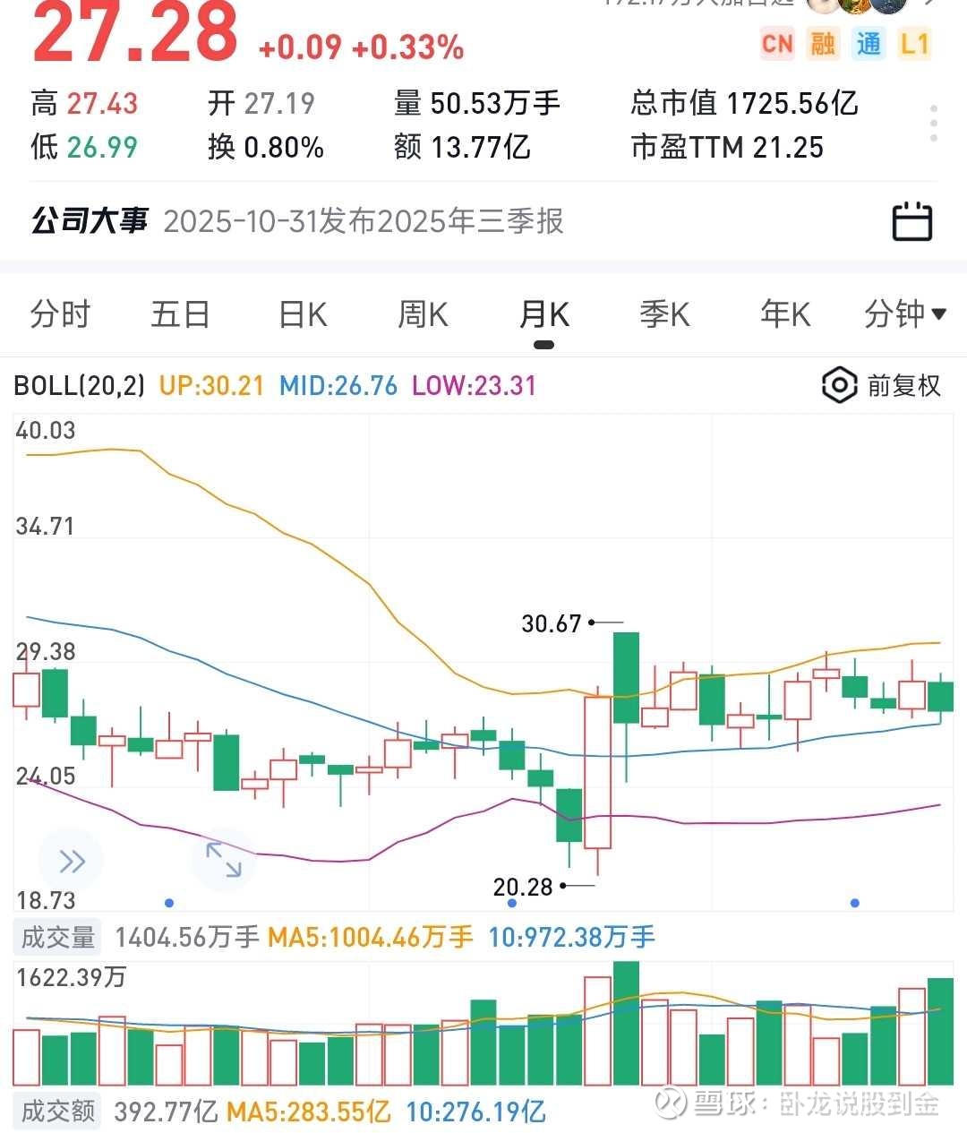 伊利股份的股价,自2024年低点21元附近反弹至30元附近,已经形成了双底形态,60日均线(约26.8元)构成短期支撑。若四季度消费旺季,催化业绩超预期,有望突破28.5元中线压力位。