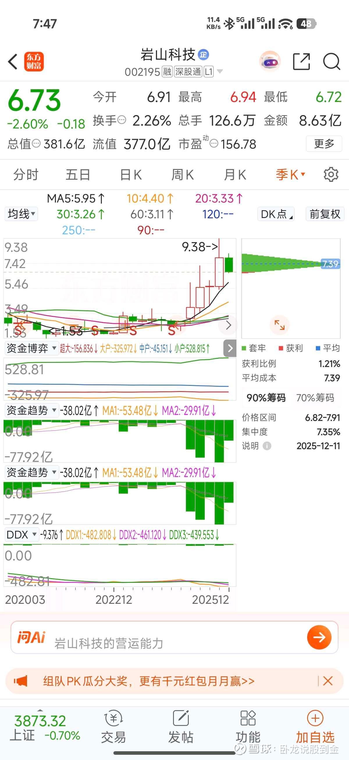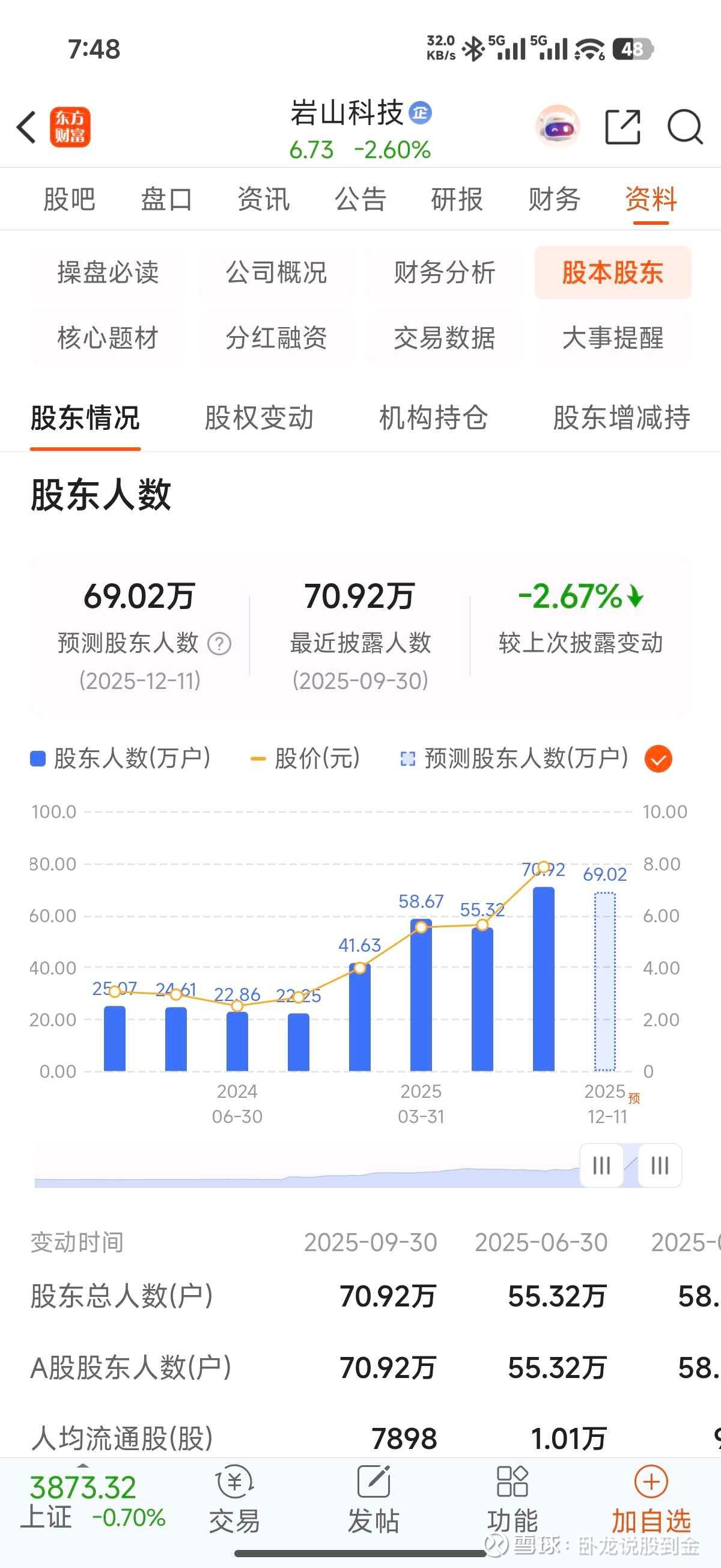 今天卧龙就再看了一眼,结果不看不知道,一看吓一跳。岩山科技居然有70万的股东,这么样的一只盘子,居然也能容纳70万的股东,可见筹码是多么的分散啊!