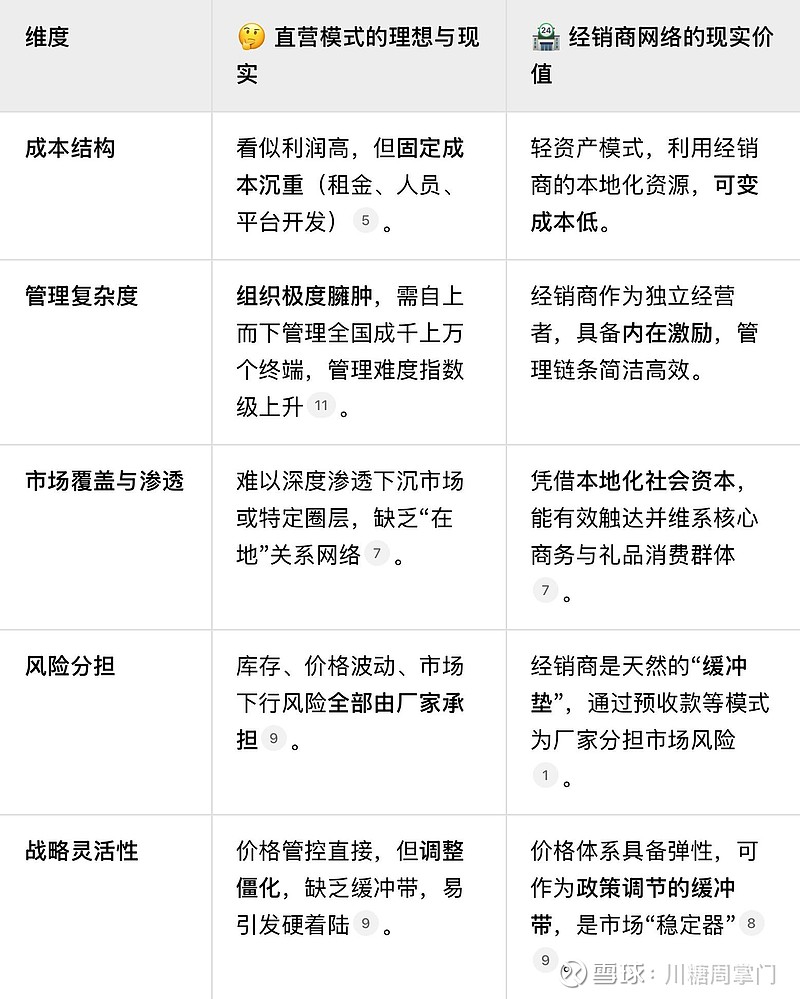 茅台能不能全面转向直营模式,本质上是一场关于成本效率、组织能力与商业规律的深层博弈。尽管直营能带来更高的单瓶利润,但全面推行可能引发系统性问题,我们用下面一张对比图下:
