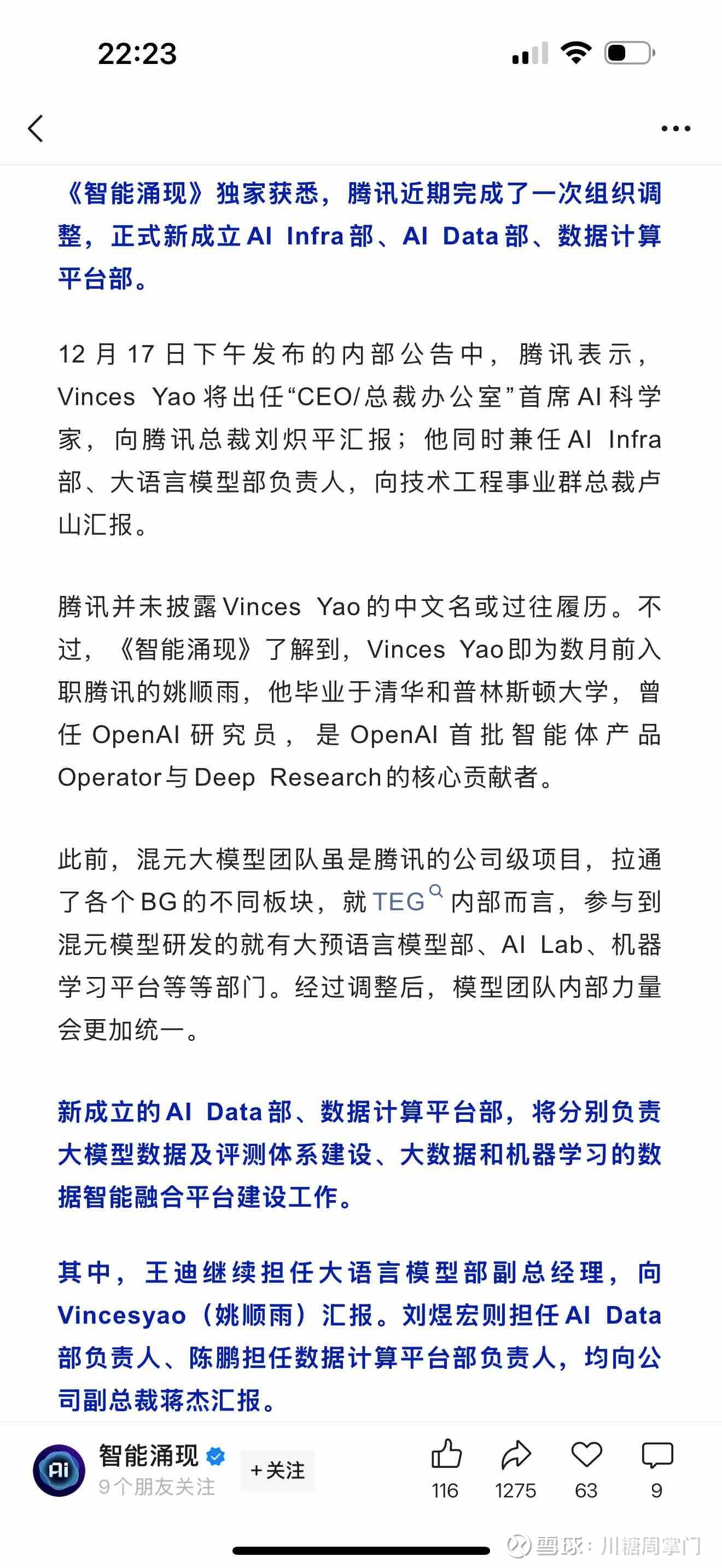 1、Vinces Yao将出任“CEO/总裁办公室”首席AI科学家,向腾讯总裁刘炽平汇报;他同时兼任AI Infra部、大语言模型部负责人,向技术工程事业群总裁卢山汇报。
