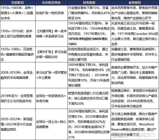 1910s受一战影响,海外市场拓展受阻;1920-1933年美国禁酒令期间,民用烈酒市场近乎停滞;1929年大萧条持续压制消费需求;1941年二战爆发后,生产资源被优先调配至军工领域。公司靠医疗用酒特许经营才勉强活下来,营收跌幅被控制在8%以内。