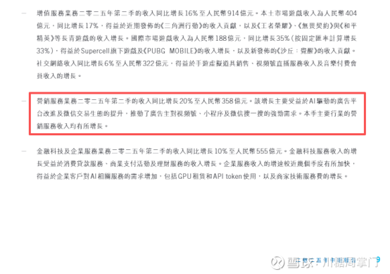 腾讯的财报未单独列示视频号营收,但是从数据可见,营销服务逐年增长,报告中也提到微信生态内视频号、小程序和搜一搜等重点广告位需求持续强劲;AI应用深入广告系统,带动广告点击和转化率进一步提升,微信交易增长与生态持续完善亦带动内循环电商广告潜力持续释放。