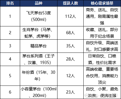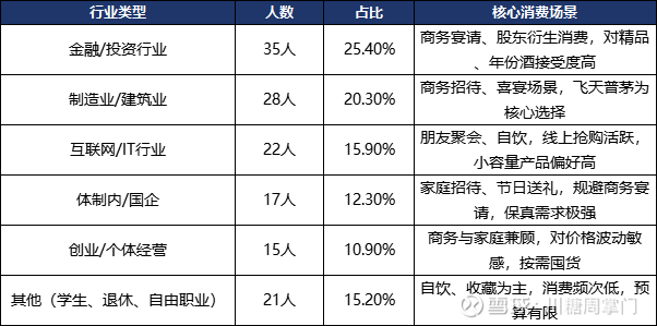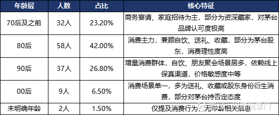 年龄结构上,80后占比超4成,是茅台消费的核心力量,兼顾商务、自饮、收藏多场景需求;90后占比26.8%,成为重要增量群体,其消费场景更聚焦自饮与朋友聚会,依赖线上渠道,对小容量、高性价比产品偏好明显。