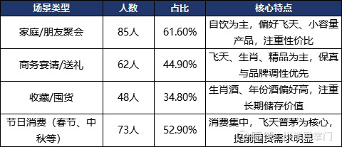 明显弱化的场景是政商务刚需、大规模应酬,高频使用的场景是(1)家庭聚会 / 家宴(2)过年过节(3)送父母 / 长辈(4)好友聚餐