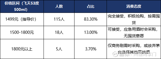 4、现在价格会继续喝茅台,主要会买500ml飞天、精品、生肖、375ml、200ml飞天,以前也会经常喝小郎酒、老窖、洋河的口粮酒,随着年龄增大,现在不会随便拿酒喝了,觉得人一辈子喝酒的量有限,喝多了对身体不好,但喜欢喝酒,遇到美食、过节时或在看球时忍不住想喝酒,因喝酒能带来更多快乐,未来打算少喝酒,只喝好酒,喝好的老的红酒和茅台,至少囤四五年再开瓶喝,以前喝的都是常规飞天,没喝过精品,现在价格下来了也许会尝试下,要是遇到五粮液和泸州老窖也许会稍微喝一点。