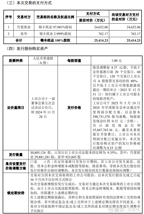 上市公司于 2025 年 5 月 19 日 2024 年年度股东会审议通过年度利润分配方案,以总股本 298,731,378 股为基数,每股派发现金红利 0.12 元(含税),共计派发现金红利 35,847,765.36 元。截至本重组报告书签署日,上市公司本次利润分配已实施完毕,本次发行股份购买资产的发行价格相应调整为 8.25 元/股。