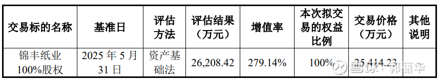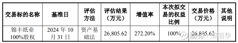 根据安永评估出具并经国资有权机构备案的《加期资产评估报告》,本次评估采用资产基础法的评估结果,锦丰纸业 100%股权价值为 26,208.42 万元,增值额为 19,295.81 万元,增值率为 279.14%。