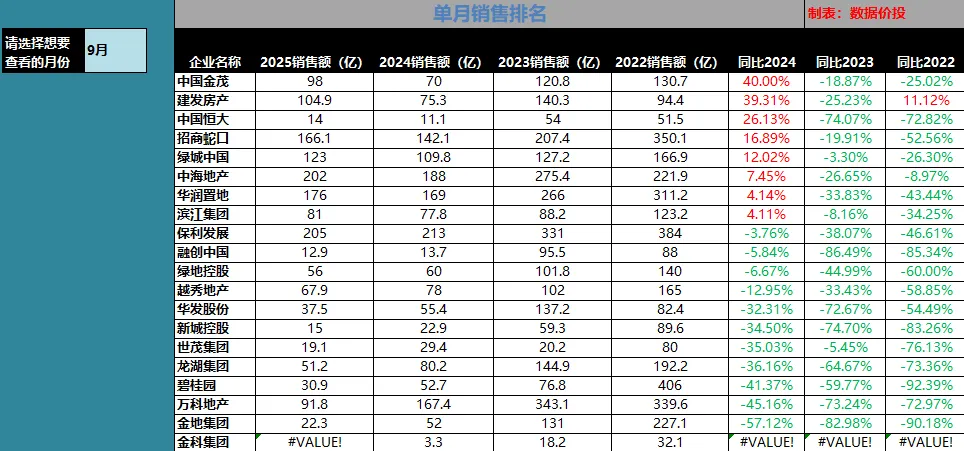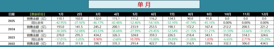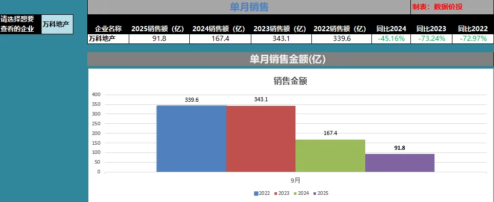 万科9月单月销售额为91.8亿元,同比2024年同期下降45.16%,同比2023年同期下降73.24%,同比2022年同期下降72.97%;