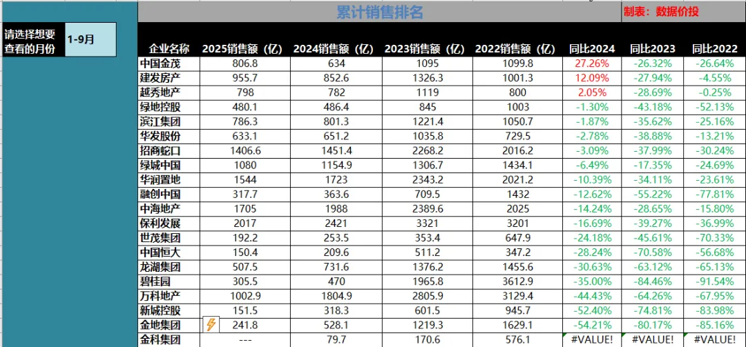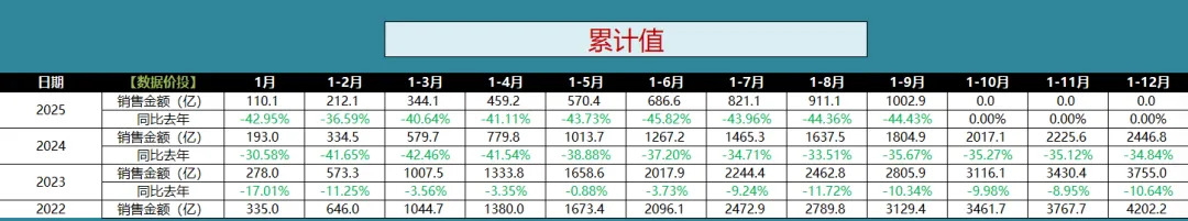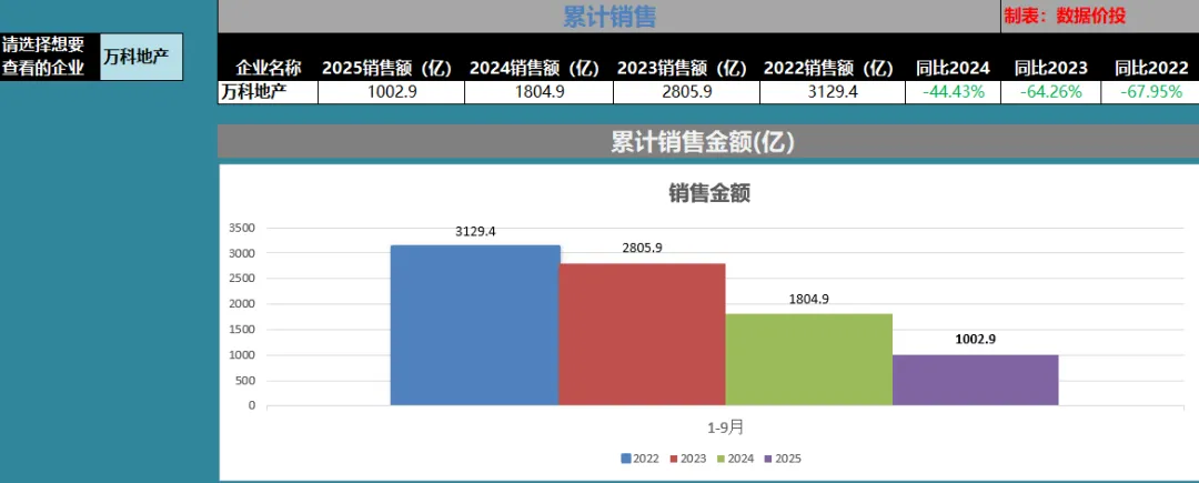 万科1~9月累计销售额为1002.9亿元,同比2024年同期下降44.43%,同比2023年同期下降64.26%,同比2022年同期下降67.95%;
