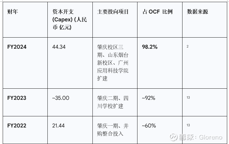 营收增长的质量在发生变化。FY2020-FY2022主要依靠**外延并购(M&A)驱动,这种增长虽然快,但也带来了巨额的商誉和债务包袱(即当前的痛点)。FY2023-FY2024则转为内生增长(Organic Growth)**驱动,主要依靠新建校区(肇庆、烟台)带来的容量扩张和学费的自然上涨。从投资角度看,内生增长的质量更高,但需要巨额资本开支作为前置条件。