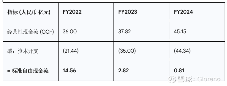 资本开支的黑洞效应: FY2024财年,公司资本开支高达人民币44.34亿元 2,几乎耗尽了所有的经营现金流。这直接导致当期自由现金流仅为约8100万元。通过深度拆解,我们发现其中超过80%的支出属于扩张性支出(Growth Capex),而非维持性支出(Maintenance Capex),这意味着这部分支出的停止是可控的。