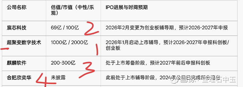 $ST汇洲(SZ002122)$ $宸芯科技(NQ874661)$ 汇洲智能创投基金参股的宸芯科技(874661)2026年2月9日公告将上市辅导板块从北交所变更为深交所创业板。宸芯科技是中国信科旗下无线通信SoC芯片平台,2026年2月将上市板块从北交所变更为创业板,目前处于辅导期,是汇洲智能参股中进展最明确的项目。截图为汇洲智能参股公司中正在IPO的进展情况。
