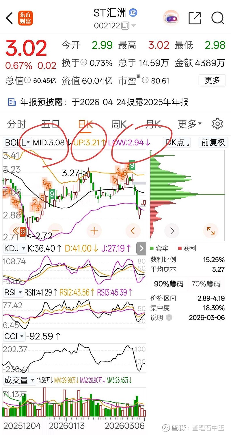 按着汇洲智能今天的股价,3.02可以卖出,明天绿开再买入。低于中轨价格属于弱势空间,很容易砸下来,尽量水下买。