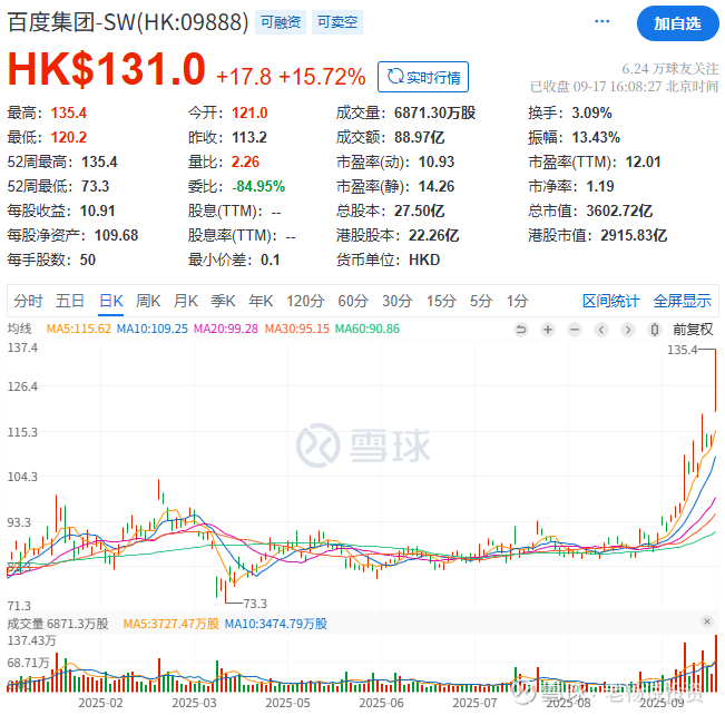 百度集团股价近日持续走高,9月17日收盘,股价达到131港元,涨超15%。消息面上,日前,百度集团与招商局集团签署重大合作协议。9月15日,招商局集团与百度在深圳签署战略合作框架协议,双方将围绕大模型、云计算等前沿人工智能技术,联手探索“AI+产业”新路径。此外,8月21日,昆仑芯称,中标中国移动2025年至2026年人工智能通用计算设备(推理型)集中采购项目十亿级订单。百度作为昆仑芯第一大股东,持股59.45%。财报方面,2025年第二季度,受AI驱动,百度集团涵盖智能云在内的AI新业务收入首次超过100亿元。