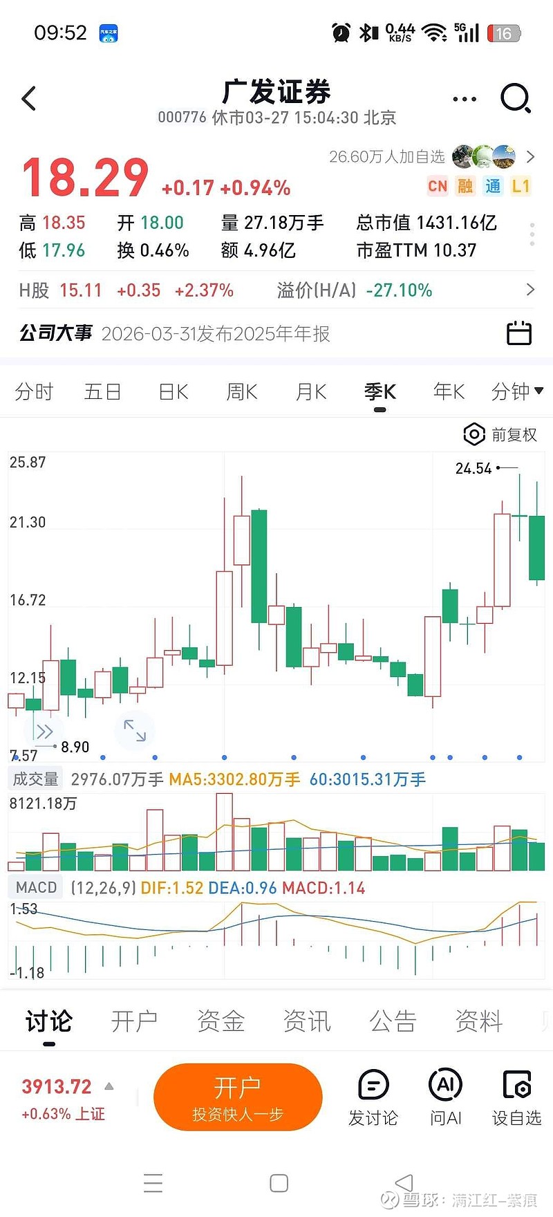 $吉林敖东(SZ000623)$从广发的季K已经可以看到:25年四季末与三季末的股价差是负值阴K,(两K间收盘价变化不大)而熬东是权益法记帐,广发又是熬东最主要的收益来源。所以全年业绩略等于三季报。(这个在12月31日就已经被固定并摆在那里了,不用等到4月18)四季度也没什么异常啊。(中药几乎没看的必要,也不用报希望)