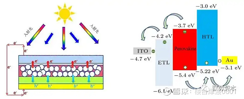 3)载流子抽取和收集:ETL的导带低于钙钛矿层的导带,价带也低于钙钛矿层的价带,能选择性抽取电子而阻挡空穴,HTL则相反,从而实现电子和空穴的选择性抽取。电子和空穴进入各自的传输层中后,经过输运被两侧电极收集,与外电路连通即有电流产生。