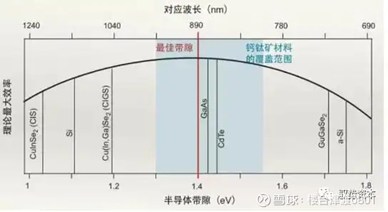在钙钛矿材料的带隙覆盖范围内,可实现单结太阳能电池最大理论效率。带隙是决定半导体利用太阳光能力的根本因素之一,因为不同频率太阳光的能量不同,窄带隙半导体的电子不能被长波光所激发,宽带隙半导体虽然可利用的光波范围广,但光子能量的利用率低,根据肖克利-奎瑟极限(Shockley–Queisser limit),单结太阳能电池的理想带隙应该为1.4eV,该带隙下太阳光能量转换为电能的转换效率为33.7%。相比之下,硅的带隙仅为1.12eV,理论转换效率为29.4%,因此钙钛矿电池在转换效率方面超过晶硅电池。
