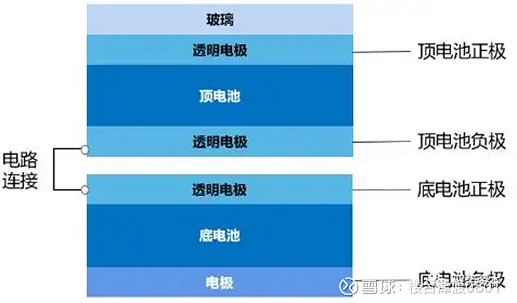 四端叠层电池:将顶电池和底电池分别制作完成,再上下机械堆叠在一起实现光学上的耦合,但实际两块电池独立运作,通过外部电路串联起来。四端叠层电池因为两个部分的独立性,制备工艺上不会相互制约,可自由的选择电池材料和带隙,不过由于存在更多电极层和电池间的材料,光能量在传递过程中可能存在更大损失,总体工艺材料成本也会增加。