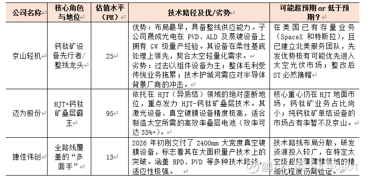 京山轻机优势主要在成套产线,它是目前极少数能提供从清洗、镀膜、蒸镀到封装全流程设备的企业。对于 SpaceX 这种强调“垂直整合”的公司,选择一家能负责全线良率的供应商风险最低。因此京山轻机有望成为 SpaceX 合作伙伴(如协鑫、捷佳伟创、迈为股份等)的钙钛矿整线交钥匙(Turn-key)方案首选。潜在份额 35% - 45%。