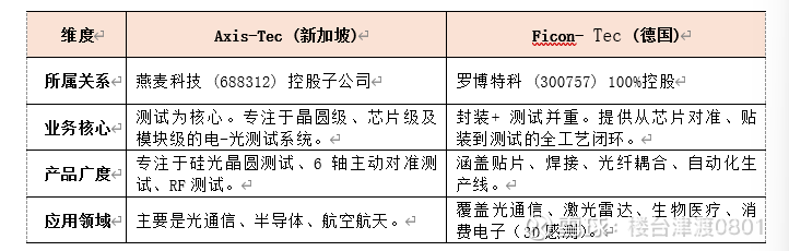 在 2026 年 AI 算力爆发和硅光子(Silicon Photonics)量产的背景下,Axis-Tec(燕麦科技子公司)与ficon-TEC(罗博特科收购公司)是全球光电自动化领域的两颗明珠。