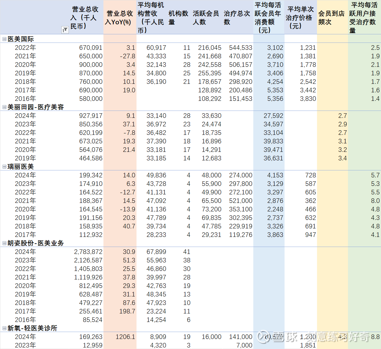 医美国际、瑞丽医美、美丽田园-医疗美容、新氧-轻医美诊所、朗姿股份-医美业务的年度营收、机构数量、活跃用户数量、用户消费金额、到店频次等数据如下表所示。