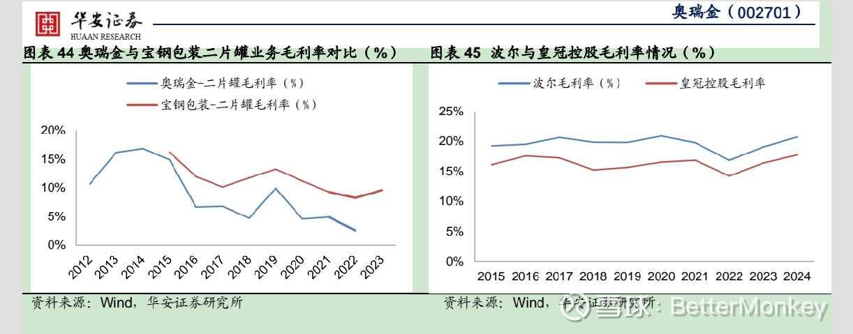 从合理利润率来看确实是一眼便宜了,就等年底谈价了,战略上来看似乎是通过三片罐20%以上毛利率的优势在二片罐上打价格战然后收购竞争对手,从宝钢包装和奥瑞金在问询函回复中披露的数据看,2019~2022奥瑞金三片罐毛利率31.7%32.4%26.3%22.6%,包钢包装彩印铁(马口铁)2020~2023毛利率10.3%10.5%5%1.94%,可能品类差异,奥瑞金三片罐成本和单价均高于宝钢彩印铁;二片罐奥瑞金2019~2022毛利率9.93%4.57%4.9%3.61%,包钢包装2020~2023毛利率11.18%9.25%8.23%9.48%,二片罐上两家成本差不多,奥瑞金单价明显低于同行,所以说主动价格战的其实是奥瑞金,目的是收购做大二片罐,现在收购完成了,也该提价恢复合理利润了查看图片