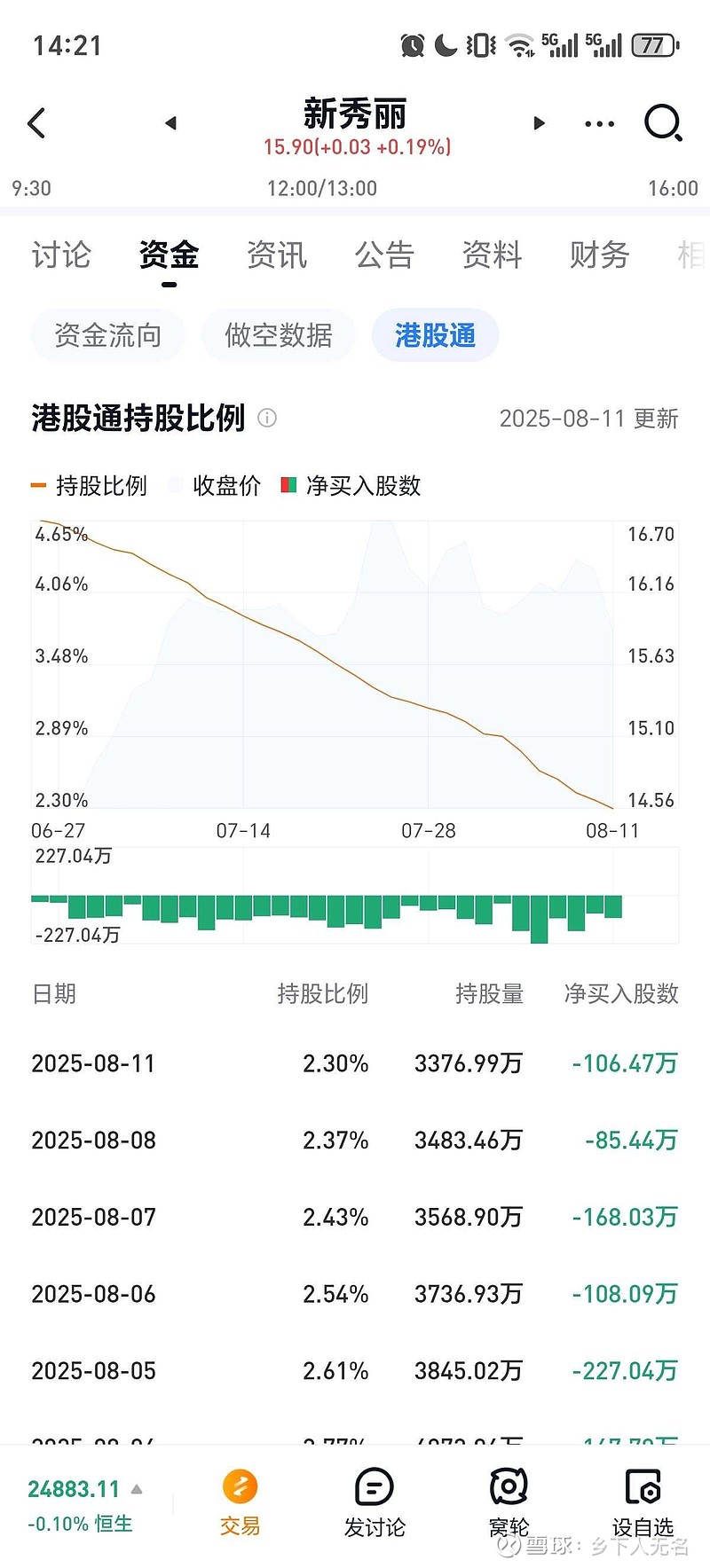 $新秀丽(01910)$ 这种卖出频率和幅度,只能说叹为观止(万能的雪友,还能找出一家类似的非踢出港股通这样卖出的不),从约14%一直卖到了现在的2%纯属看到觉得有意思记录一下,本人不持有,不看多也不看空