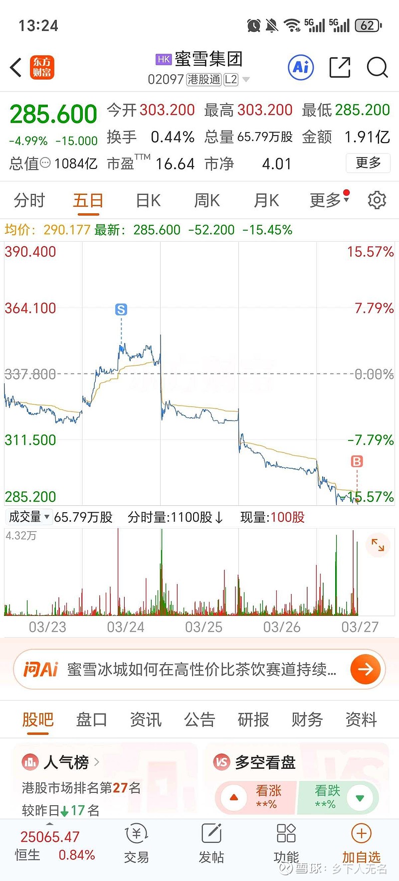 $蜜雪集团(02097)$ 三天前出财报,市场觉得不错,给了一个348T出去的机会,现在才三天,就回调了20%,一如既往的,你们不要,那我来为大家接个盘,做一回韭菜吧。切勿跟随,因为被套,挨打,看错是常态。