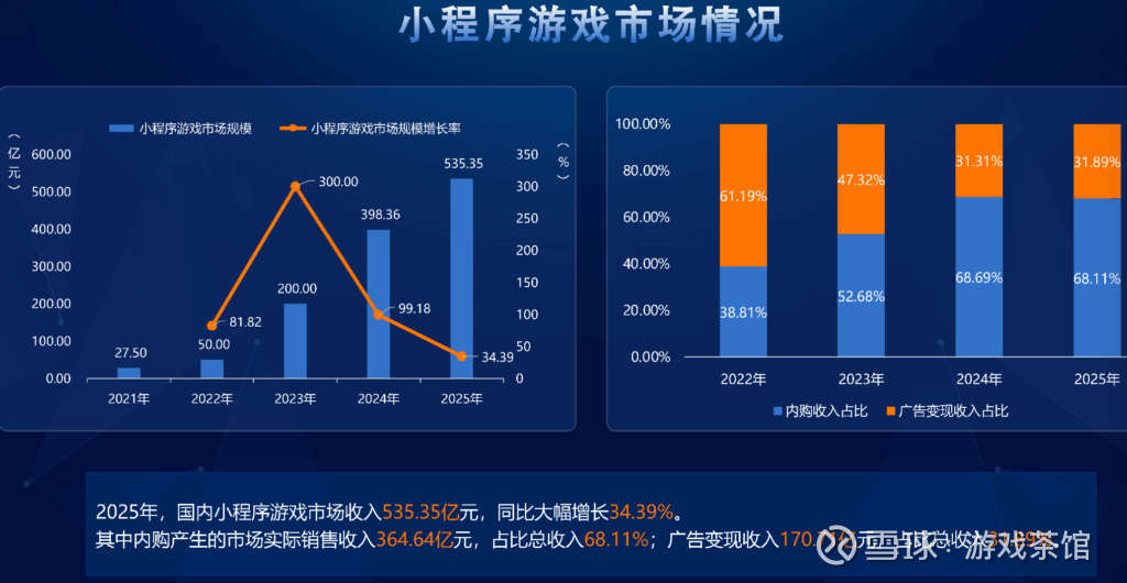 2025年,国内小程序游戏市场收入535.35亿元,同比大幅增长34.39%。其中内购产生的市场实销收入364.64亿元,占比总收入68.11%;广告变现收入170.71亿元,占比总收入31.89%。