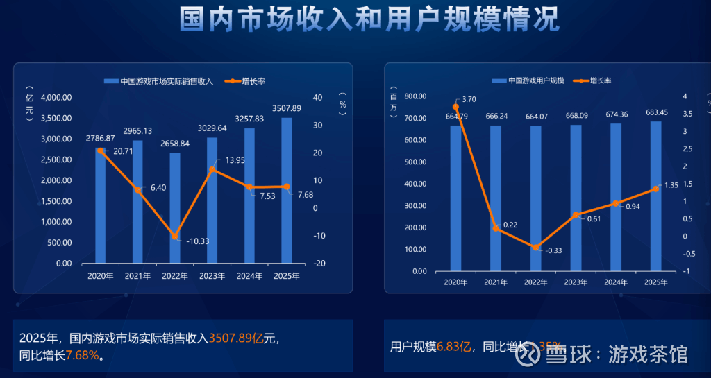 2025年,国内游戏市场实际销售收入3507.89亿元,同比增长7.68%;用户规模6.83亿,同比增长1.35%。同为历史新高点。