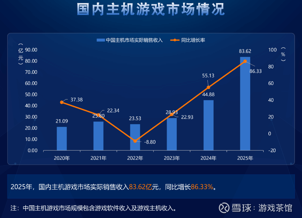 2025年,国内主机游戏市场实销收入83.62亿元,同比增长86.33%,延续了3年来的高速增长态势。